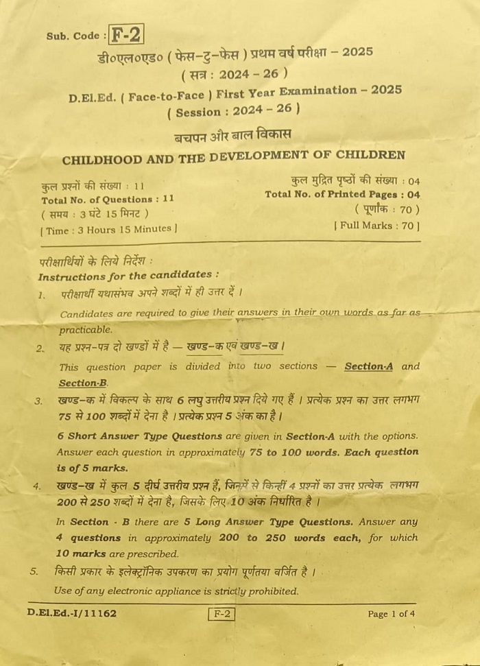 BIHAR D.El.Ed 1ST YEAR F2 बचपन और बाल विकास 2025 PREVIOUS YEAR QUESTION PAPER