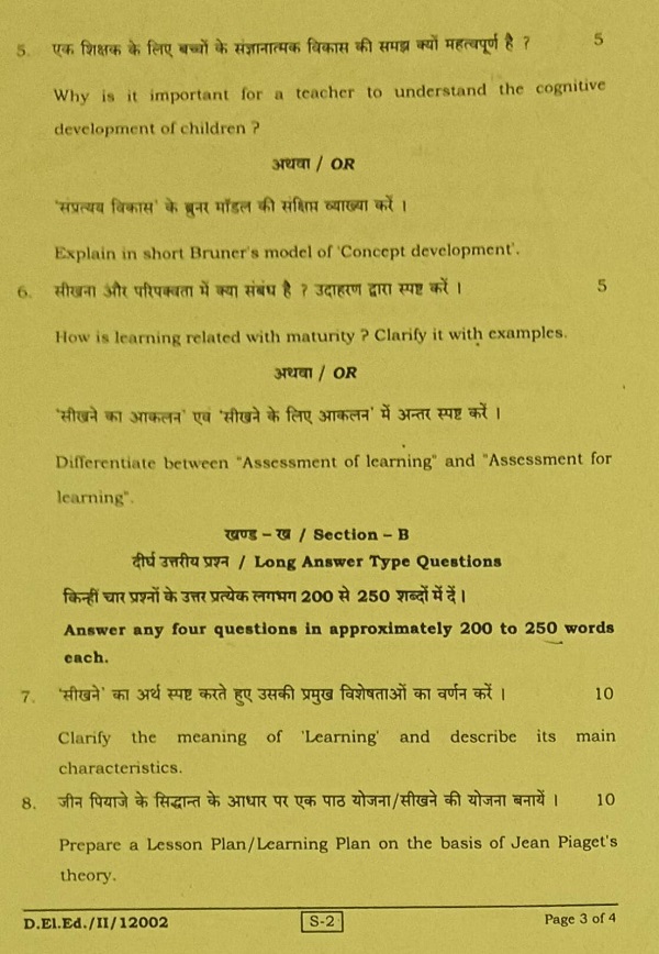 बिहार डी. एल. एड. द्वितीय वर्ष पेपर S-2 संज्ञान सीखना और बाल विकास पिछले वर्ष के प्रश्न पत्र